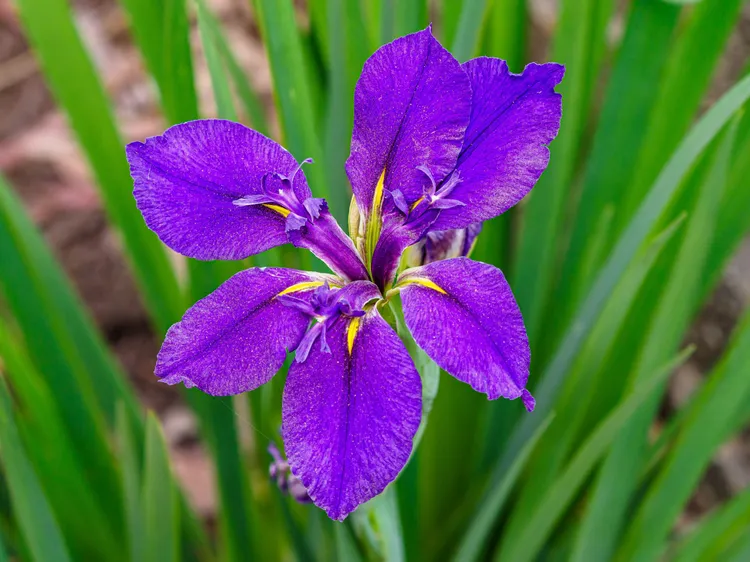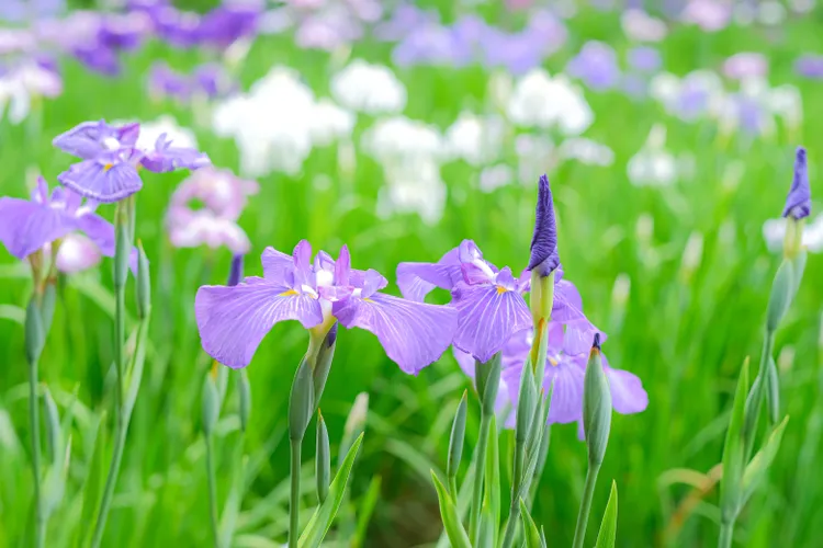 Sleek and beardless, Japanese irises (Iris ensata) love rich, moist soil and being near water features—but not soggy winters. They bloom later than Siberian or bearded ones, with more flat flowers. Plant their rhizomes vertically, tip up.