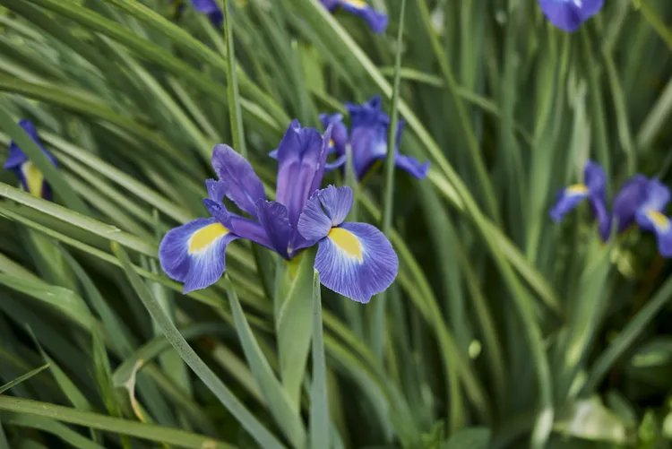 A bulbous hybrid (Iris × hollandica) from Spanish and North African sorts. Flowers in early spring, naturalizes readily. Blue, purple, yellow, sometimes orange, or mauve. Leafier leaves differentiate them.