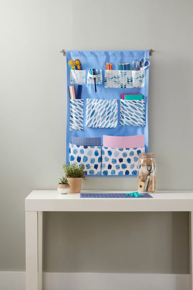 Combine a durable scrap of fabric for the backing with small pieces to make wall-hung organizers. Plan your pocket configuration based on what you want to store—craft supplies, mail, or office materials.