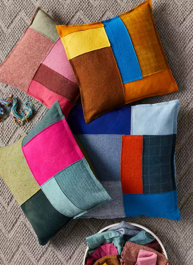 Create a unique pillow out of pieced-together scraps of fabric. Experiment with combinations of texture and weight to find combinations that are stunning and self-supporting.