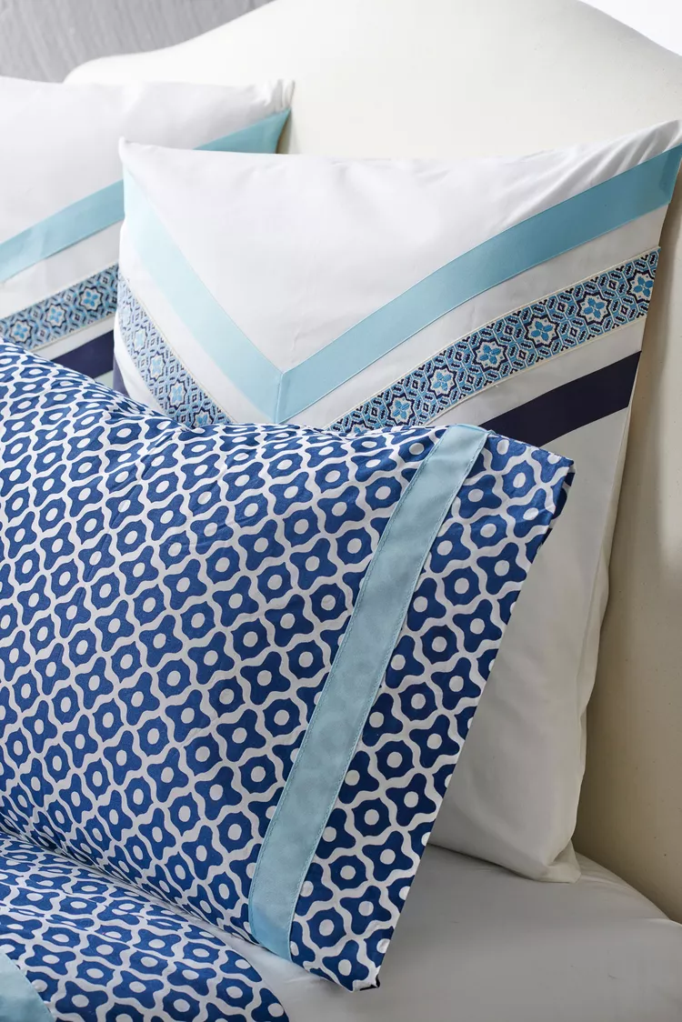 Breathe new life into tired pillow covers with ribbon-style fabric trims. Press in small hems into your scrap strips, then attach them to the covers by sewing or gluing them on to add color, pattern, and personality—without buying new ones.