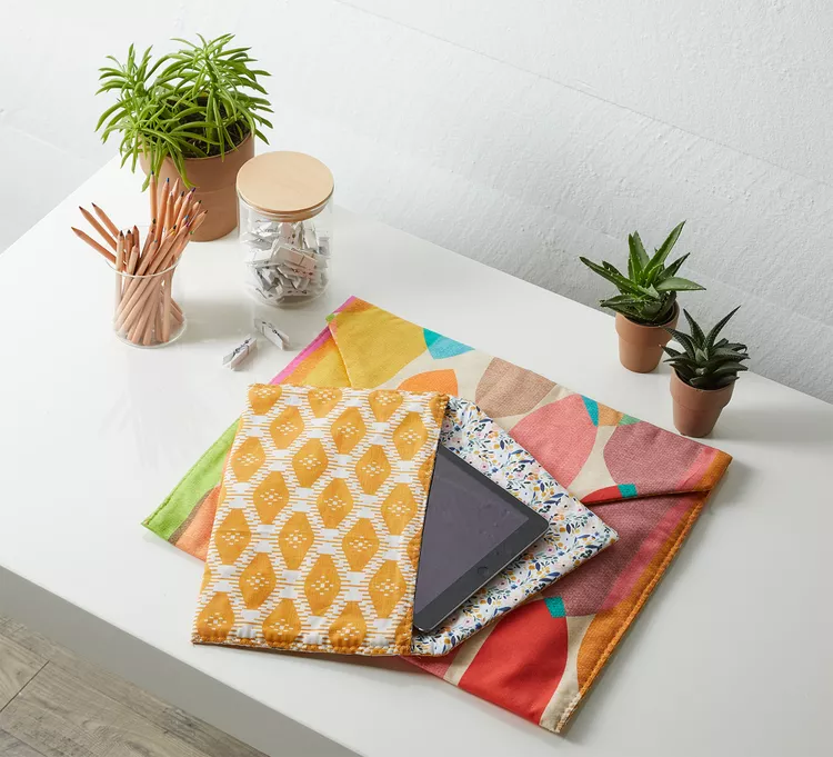 Work with an envelope-pattern template to create a plush sleeve for your laptop or tablet. Sew a couple of pieces of scrap fabric, insert some light padding, and finish with your preferred closure for a one-of-a-kind, protective sleeve.