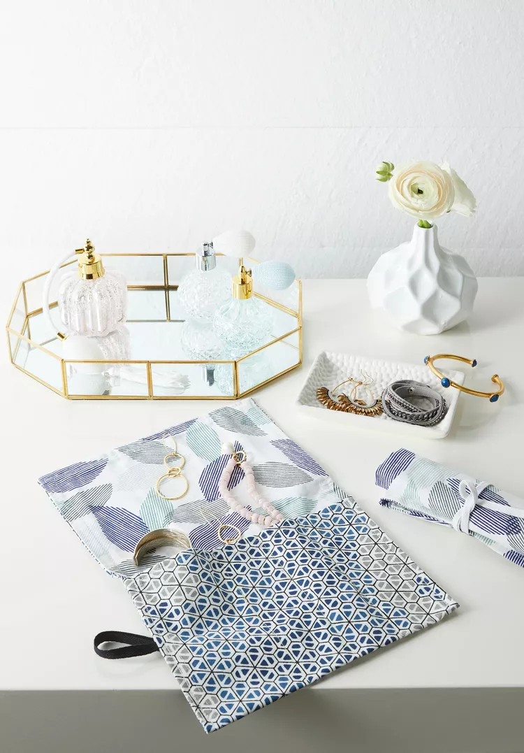 Roll-up jewelry pouch is a great accessory organizer while traveling. It’s easy to make, and you may add more compartments for personalization. Incorporate mixed prints for the added charm and functionality.