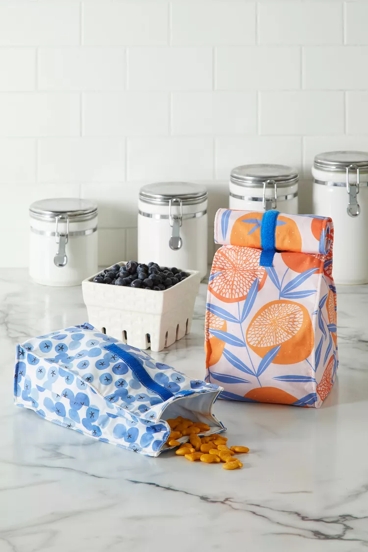Sew a roll-top Velcro closure reusable sack lunch out of fabric scraps. For cleaning ease and longevity, line the interior with water-resistant material.