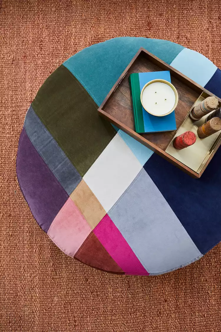 Have fun with a patchwork ottoman—or start small with a stool or bench. Organize your scraps first to chart the design. Use thicker, non-stretching fabrics for crisp seams and lasting wear.