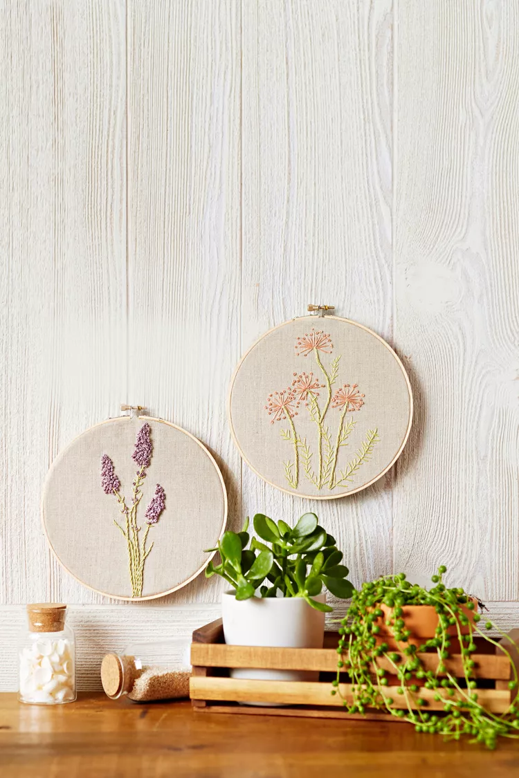 Design a beautiful flower pattern on linen edged with a wooden hoop. Use simple stitches and knots to form petals and leaves, perfect for embroidery beginners.