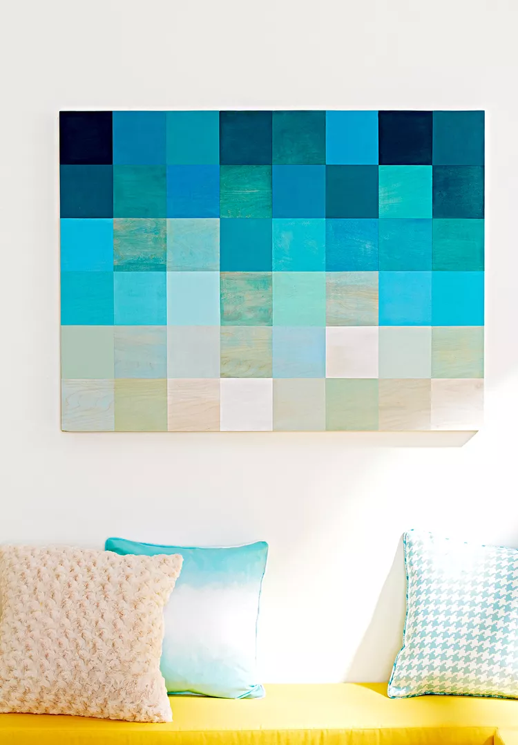 Sand and clean, mark a grid, tape and paint squares in a gradient of colors. Dry between applications and hang your customized artwork.