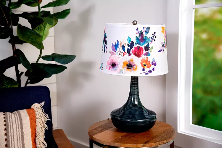 Give a lampshade a new look with fabric. Measure and cut fabric with a 2-inch overlap, fold edges neatly, apply fabric glue and spray adhesive to hold in place, and brighten up any room.