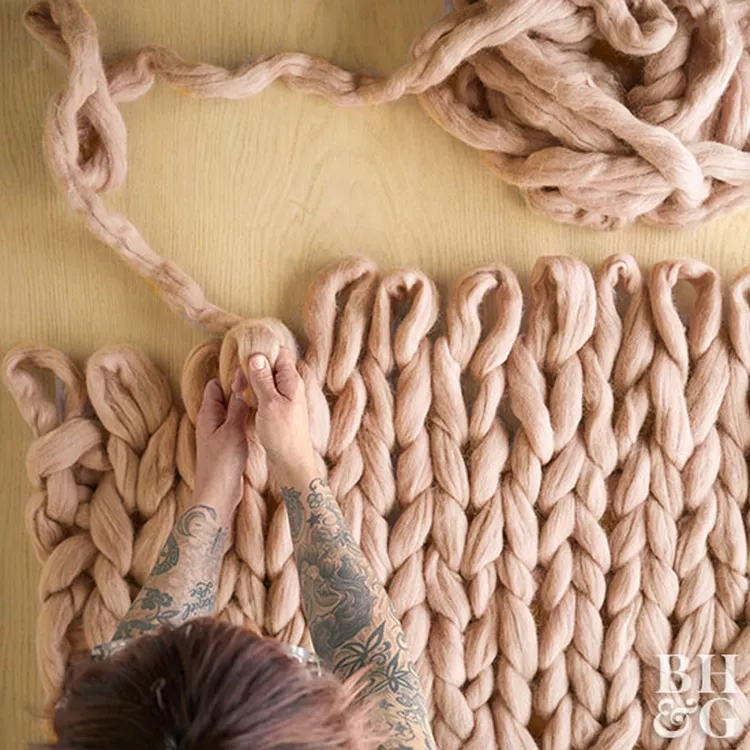 Try this calming arm-knit blanket project—no prior knitting skills necessary. Utilize an online tutorial and a few 12 skeins of arm-knitting yarn to create a cozy chunky throw.