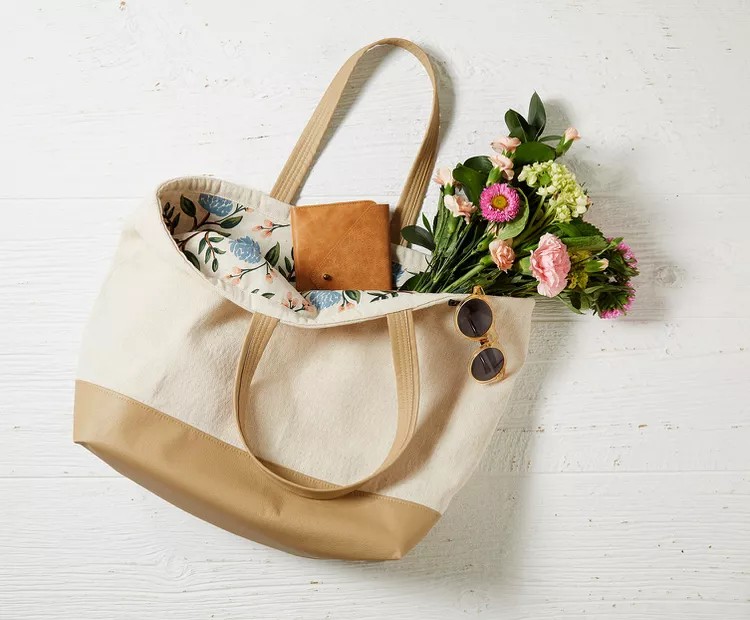 Sew a canvas tote bag with your favorite canvas, leather trim, and a pretty lining fabric. Use heavy interfacing for the bottom and a denim needle to negotiate thick layers.