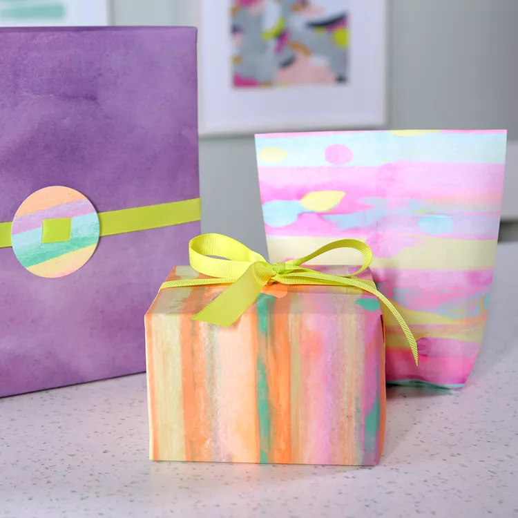 Transform plain white paper into beautiful gift wrap using acrylic paints. Drag paint with a ruler or straight edge to create stripes, swirls, and other playful designs.