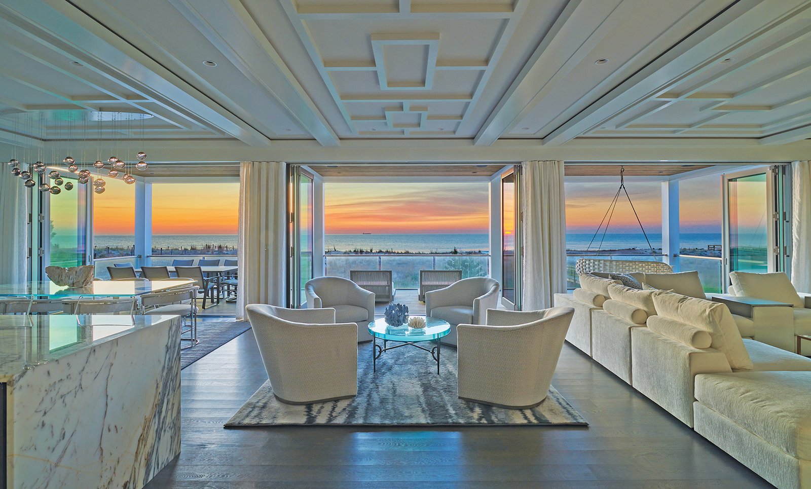 Cool sea breezes flow through casement windows and nine folding doors, combining with a sophisticated modern interior. From the tray ceiling in the great room to a glass-framed sculptural staircase, the details elevate the design well beyond the typical beach house.
