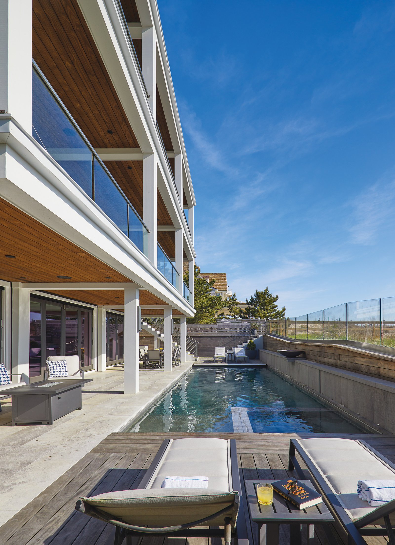 The first floor is fun time—with bar, golf simulator, TV lounge, and bunk room for kids’ sleepovers. Sliding glass doors give way to a pool deck; marble floors flow outward to a terrace, pool, and spa for the ultimate in relaxation.