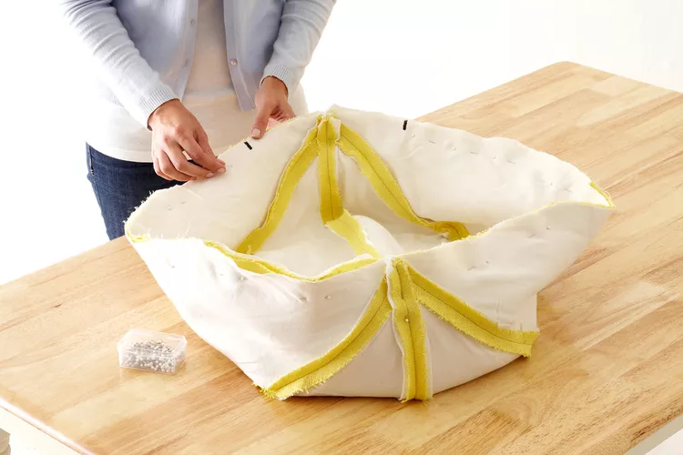 Once stitching is done, remove basting threads from octagon edges. Place your finished pouf in your living room—or make a pair to tuck under console tables or beside a fireplace for stylish extra seating.