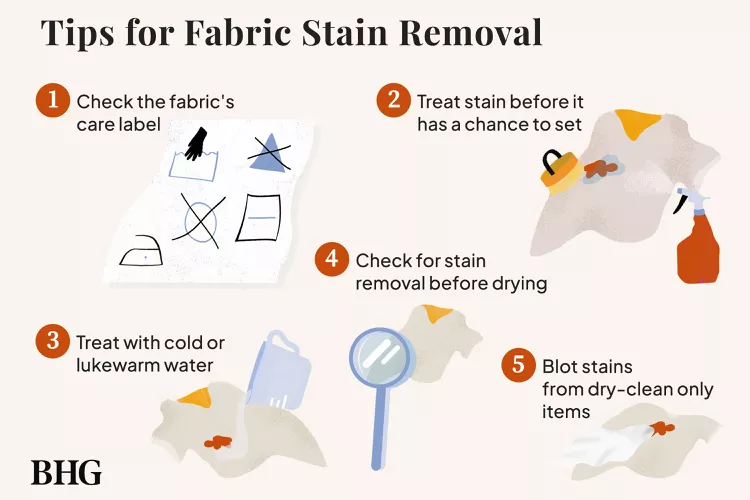 • Test first: Always test any stain remover on a sight-out area (e.g., a seam) before applying to the whole stain.