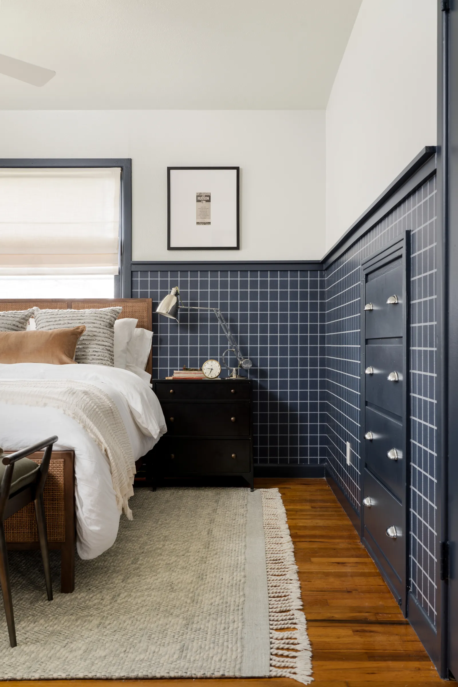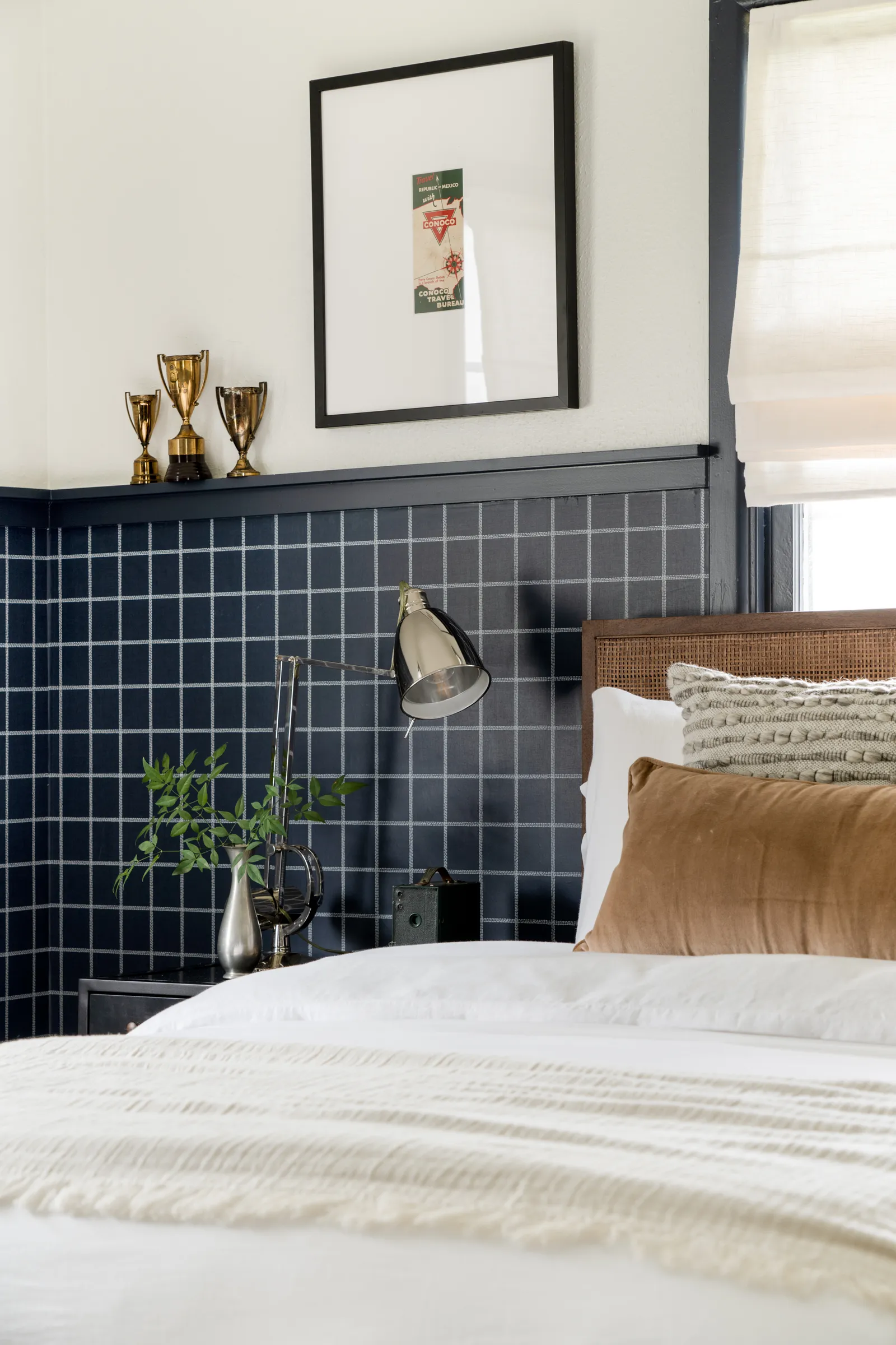 The master bedroom in the original house was another clean slate—white walls, white trim. The designer brought it to life with navy blue paint on the trim and matching Magnolia (Sunday Best) wallpaper in a white-and-navy design below it. « Pigmenting all the trim the same color serves to really connect the walls visually, » the designer says. And, matching the wallpaper’s navy to the trim provides depth and visual cadence.