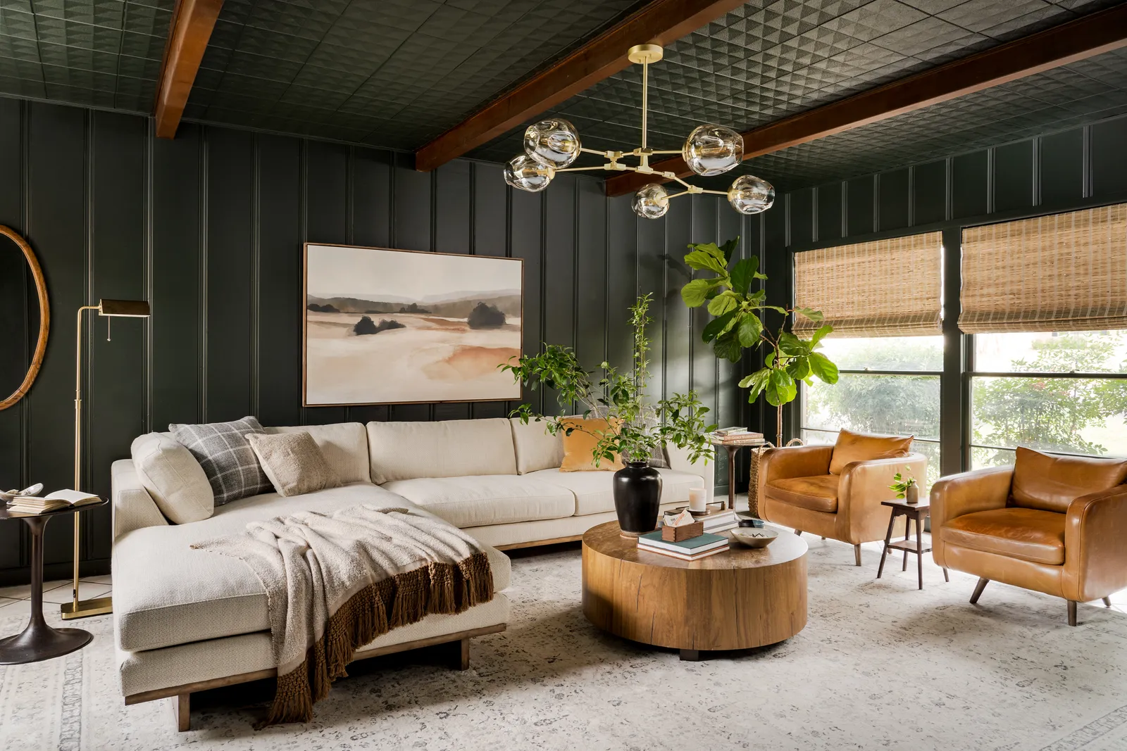 The homeowners wanted their living room to feel like a modern, intimate den. To stay within budget, the designer focused on high-impact updates like new lighting, fresh furniture, and fresh paint. The room came with old wood paneling and ceiling tiles to replace. But rather than stripping the room, the designer painted walls and ceiling in a deep green hue—Cottage Grove from the Magnolia line—creating a cozy, jewel-box feel. « We used this dramatic green on a castle renovation in Waco, and I love how welcoming it is, no matter if you’re in a historic home or a casual residence, » says the designer.