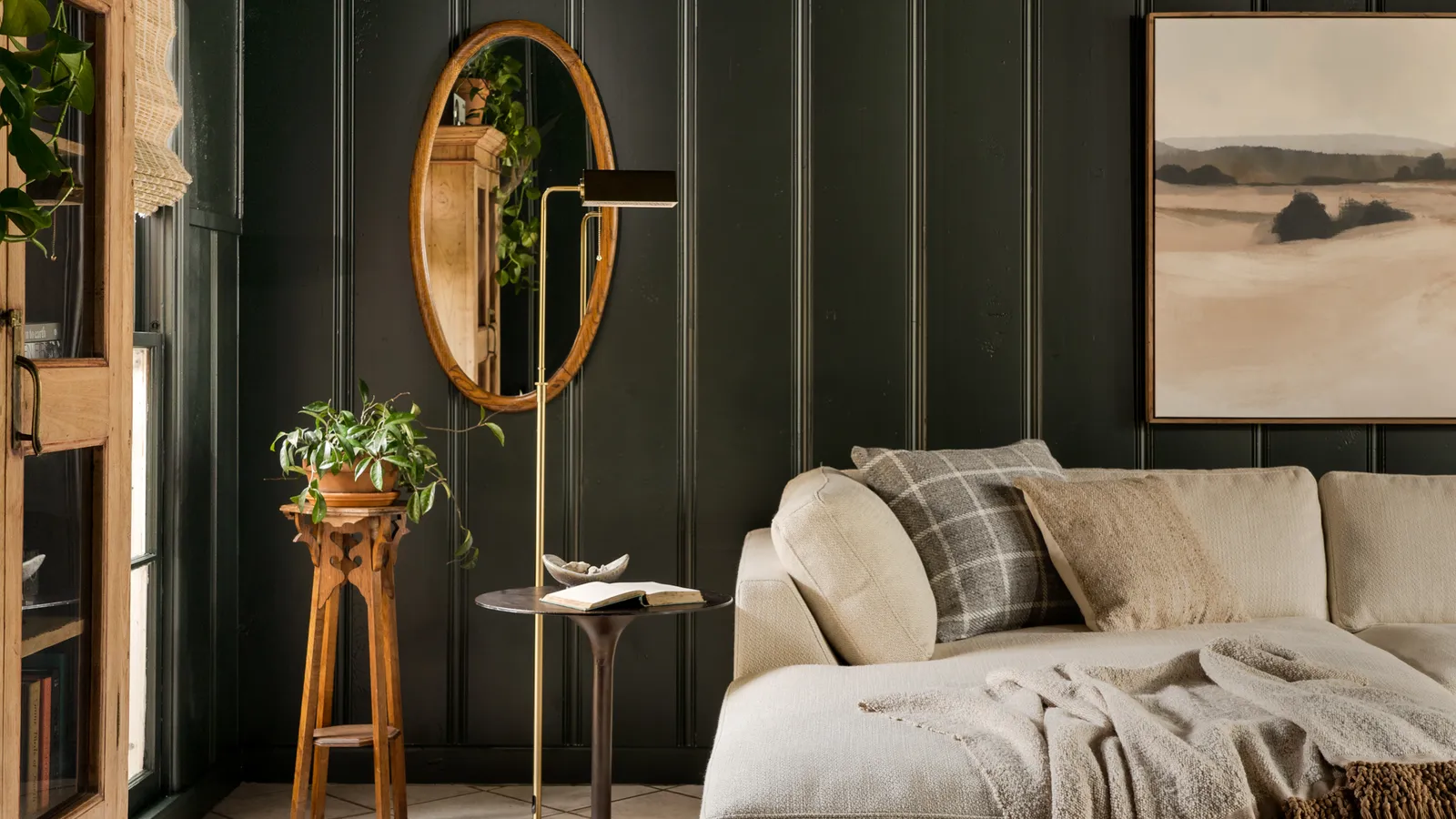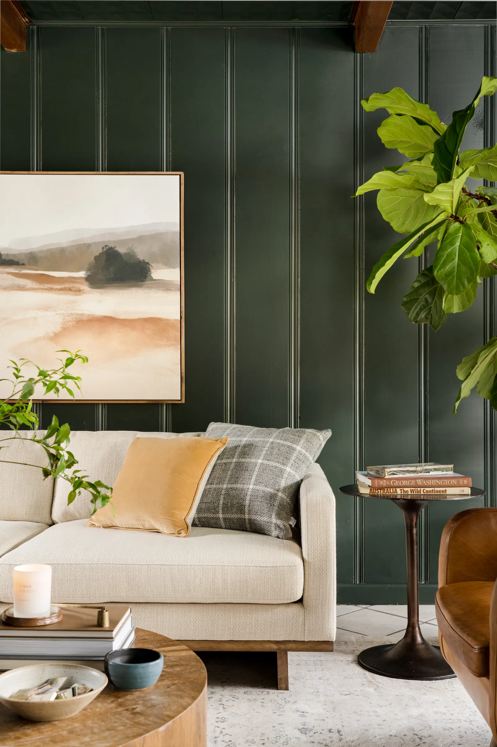 Once the large pieces were in place, they filled in the details with a fiddle-leaf fig, a mirror, and accessories.