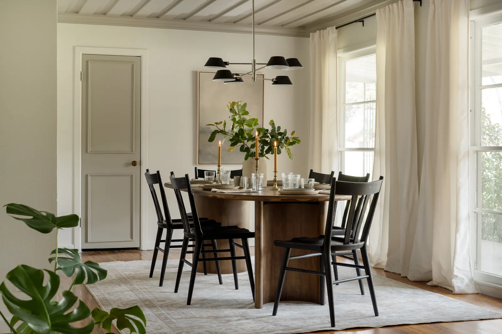 As for furniture, keep it simple: a curved edge oval dining table, black Hawkins dining chairs for contrast, and velvet light-filtering curtains that the designer calls the « unsung heroes » of the room. They add warmth and bring in « luxe texture » without blocking the natural light.